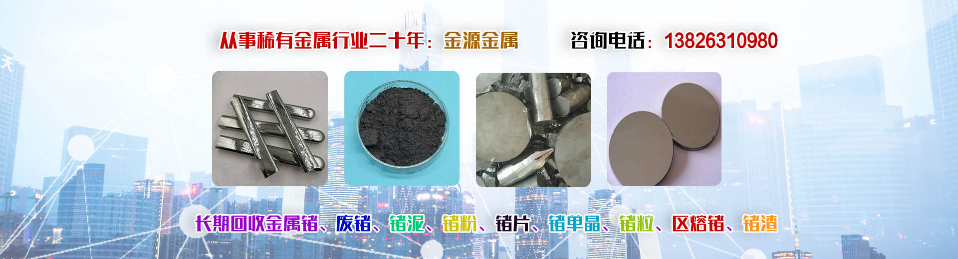 韶关市金源金属材料有限公司坐落于中国广东省韶关市,长期收购回收铟、精铟、粗铟、铟丝、铟靶材、ITO靶材靶粉、回收金属锗、锗锭、锗粉、锗片、回收锗单晶、单晶锗、锗粒、区熔锗、工业锗、废锗、锗泥、锗渣、二氧化锗回收、四氯化锗、有机锗、银、纯银、银靶材、高价收购回收ITO废靶、回收废铟、废铟沙、废铟渣、回收粗铟、废铟丝、废铟珠、废铟箔、废铟棒、收购银焊条、银焊丝、导电银胶、金属镓、硝酸镓、氧化镓、三氯化镓、氯化镓,供应及回收氧化镓、氢氧化镓、碲化镓,硒化镓,铟粉,氧化铟、氯化铟、硫酸铟、硫化铟、醋酸铟、氢氧化铟、硒化铟,碘化铟,铜铟镓硒,含金、银、铟、铑、钯、镓、锗等稀有贵金属材料,稀土金属材料、氧化镝、氧化镥、氧化铽、氧化镨钕等回收。
